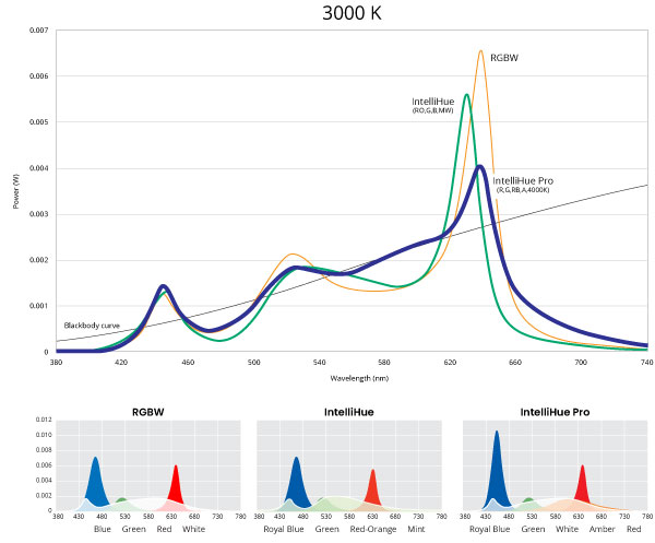 IntelliHue luminaires deliver consistent, high-quality whites and saturated colors. Thanks to their carefully selected LED mix of red, green, blue, and mint white—and smart innovations that boost output and quality—IntelliHue luminaires exceed the capabilities of RGBW and RGBA luminaires.