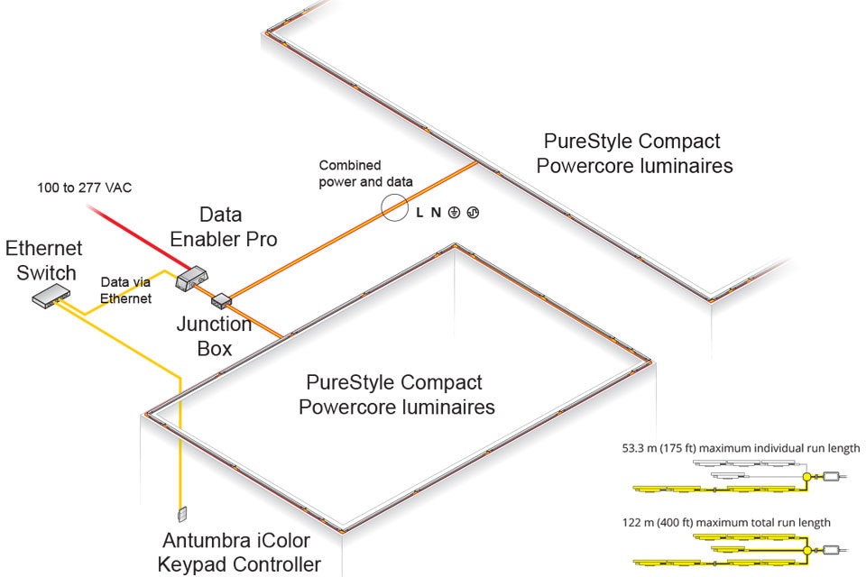 Data Enabler Pro powers both runs of luminaires with both leader cables wired into a junction box and standard cabling from there to the Data Enabler Pro. No special wiring required.